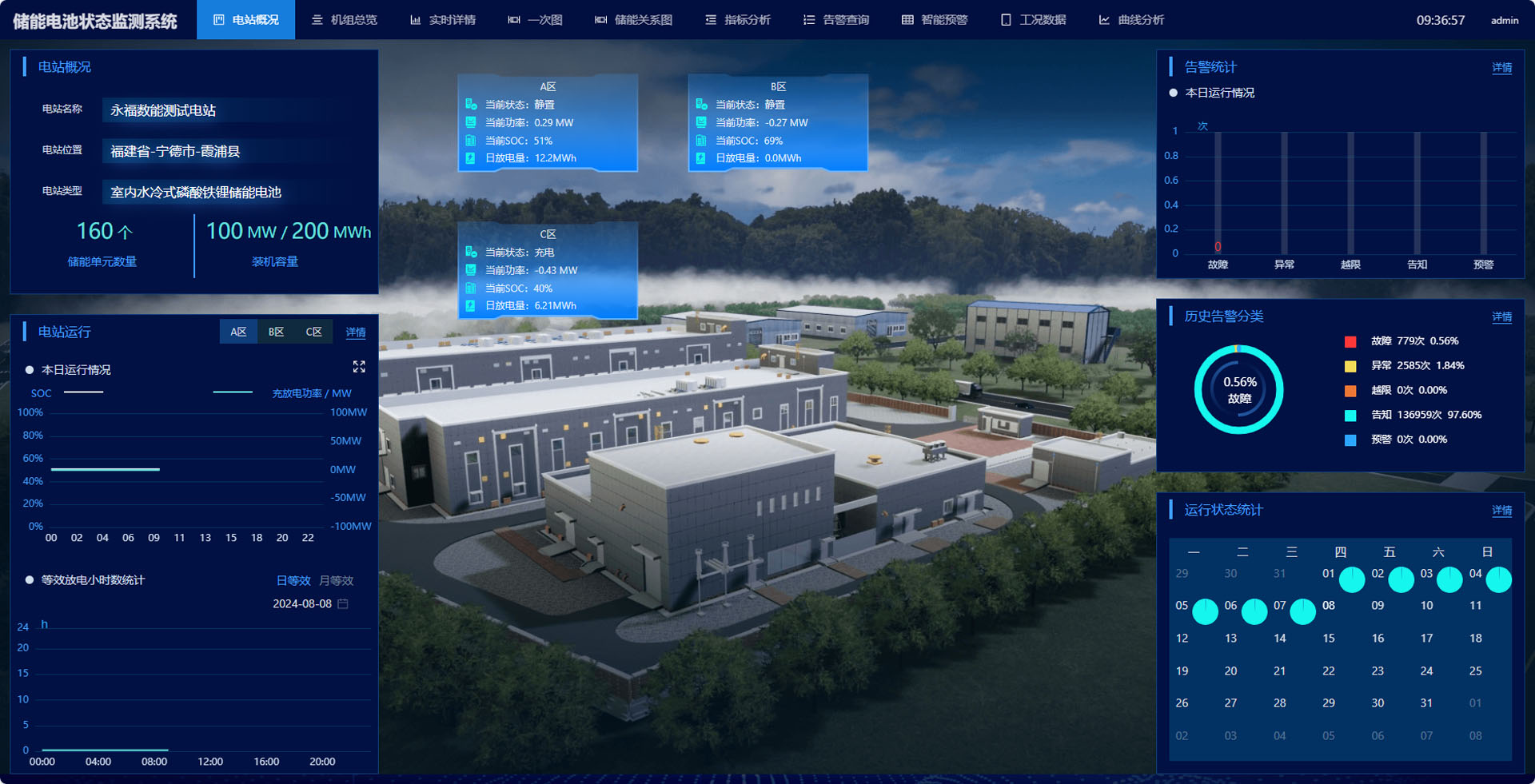 可视化手段对电池运行参数进行全景展示,具备电站概览、储能机组视图、储能单元视图、电池簇视图分层级实时监视功能。